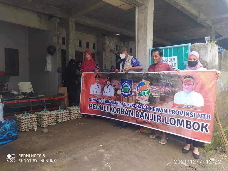 Dinas Peternakan dan Kesehatan Hewan Provinsi NTB yang diwakili oleh Kepala Bidang Kesehatan Hewan didampingi oleh Kepala Sub Bagian Umum menyerahkan bantuan berupa telur kepada korban yang terdampak banjir yang berlokasi di Bhayangkara Residence Desa Ranjok dan Desa Kapek Kecamatan Gunung Sari Kabupaten Lombok Barat pada hari ini Selasa, 7 Desember 2021.