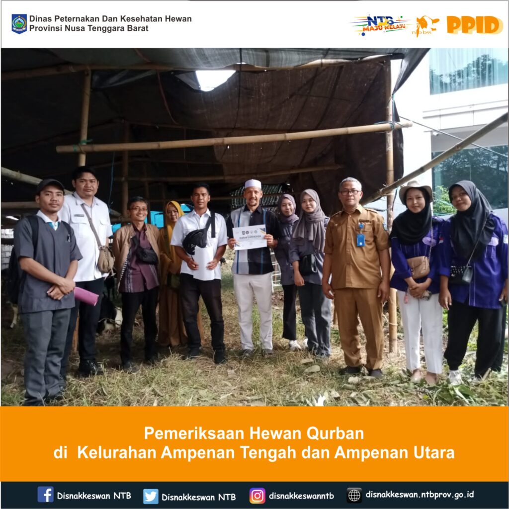 Kepala Bidang Kesehatan Masyarakat Veteriner, Lalu Muhammad Yusri, S.Pt bersama Tim Pemeriksaan Hewan Qurban melaksanakan pemeriksaan hewan qurban yang berlokasi di Kelurahan Ampenan Tengah dan Ampenan Utara dengan ternak kambing sebanyak 55 ekor untuk Kelurahan Ampenan Tengah dan sebanyak 76 ekor ternak kambing untuk Kelurahan Ampenan Utara.