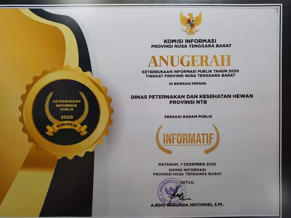 Alhamdulillah Dinas Peternakan dan Kesehatan Hewan Provinsi NTB mendapatkan Anugerah Keterbukaan Informasi Publik Tahun 2020 Tingkat Provinsi Nusa Tenggara Barat sebagai Badan Publik Informatif.