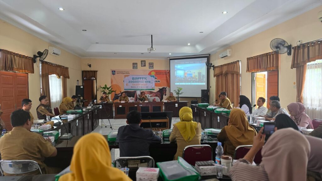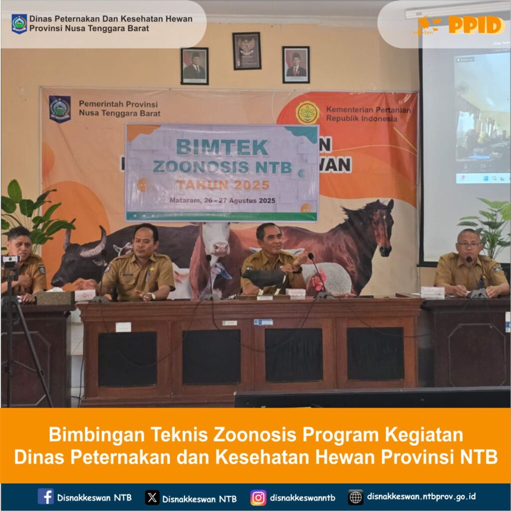 Dalam rangka meningkatkan peran petugas kesehatan masyarakat veteriner dalam mengedukasi kejadian penyakit zoonosis di masyarakat NTB, Dinas Peternakan dan Kesehatan Hewan Provinsi NTB menyelenggarakan Kegiatan Bimbingan Teknis Zoonosis yang dilakukan secara offline dan online pada tanggal 26 s/d 27 Agustus 2025 di Aula Dinas Peternakan dan Kesehatan Hewan Provinsi NTB dan diikuti oleh peserta dari Dinas yang Membidangi Fungsi-Fungsi Peternakan dan Kesehatan Hewan Kabupaten/Kota se-Provinsi NTB.