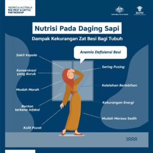 Sudahkah terpenuhi zat besi dalam tubuh? Kekurangan zat besi dapat mengakibatkan anemia defisiensi besi. Hal ini membuat tubuh memproduksi lebih sedikit sel darah merah, sehingga, oksigen tidak tersalurkan dengan sempurna ke seluruh tubuh. Akibatnya, tubuh akan memberi sinyal negatif, seperti kelelahan (bahkan setelah istirahat), kulit pucat, kekurangan energi, konsentrasi yang buruk, mudah marah, mudah merasa sedih, sakit kepala dan pusing dan sering terkena infeksi. Daging sapi mengandung 3,5 mg zat besi dalam tiap 100gram-nya lho! (IACCB)