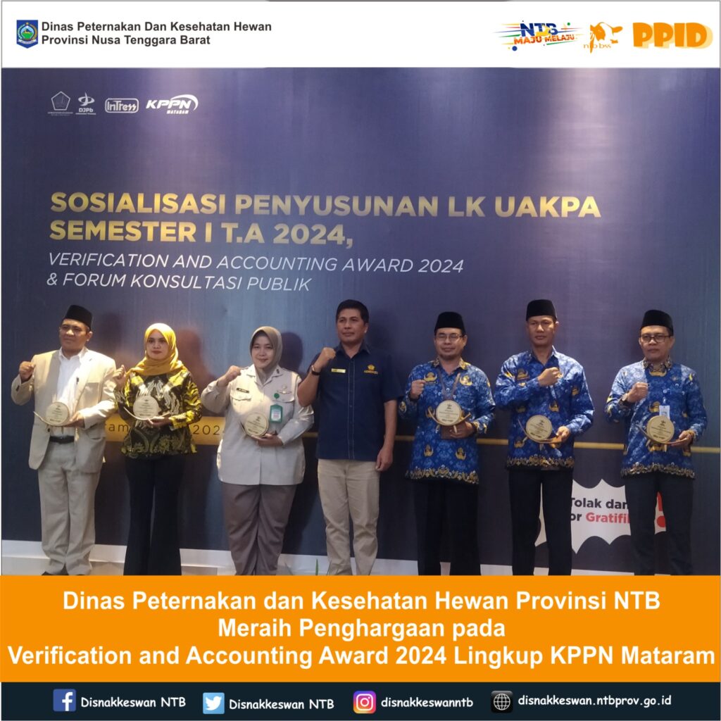 Kepala Dinas Peternakan dan Kesehatan Hewan Provinsi NTB, Muhamad Riadi, SP, M.Ec.Dev menghadiri Sosialisasi Penyusunan Laporan Keuangan UAKPA Semester I Tahun 2024 dan pemberian Penghargaan Verification and Accounting Award 2024 serta Forum Konsultasi Publik pada Satuan Kerja Lingkup KPPN Mataram, dimana Dinas Peternakan dan Kesehatan Hewan Provinsi NTB mendapatkan penghargaan Terbaik II Laporan Keuangan Satker Dana DK/TP Terbaik Tahun 2023 diterima langsung oleh Kepala Dinas yang dilaksanakan di Aula Mandalika KPPN Mataram, Rabu 17 Juli 2024.