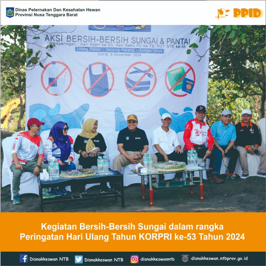 Kepala Dinas Peternakan dan Kesehatan Hewan Provinsi NTB, Muhamad Riadi, SP, M.Ec.Dev menghadiri kegiatan bersih-bersih sungai dalam rangka Peringatan Hari Ulang Tahun KORPRI ke-53 Tahun 2024, yang dirangkai dengan Hari Bhakti Pekerjaan Umum ke-79 dan Hari Ulang Tahun NTB ke-66 yang dihadiri langsung oleh Sekretaris Daerah Provinsi NTB, Drs. H. Lalu Gita Ariadi, M.Si di Sungai Unus Loang Balok, Jumat 8 November 2024.