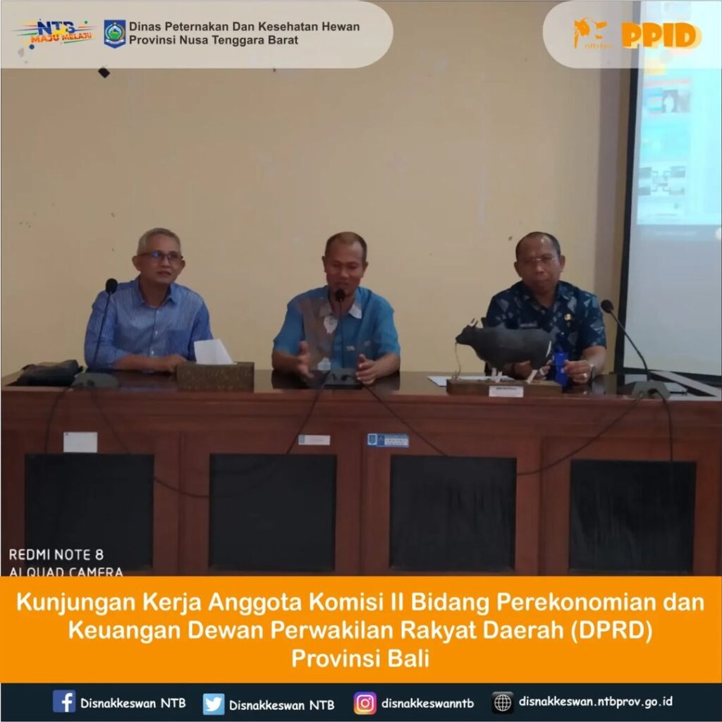 Kepala Dinas Peternakan dan Kesehatan Hewan Provinsi NTB, Muhamad Riadi, SP, M.Ec.Dev didampingi oleh Sekretaris Dinas beserta jajarannya menerima kunjungan kerja Anggota Komisi II Bidang Perekonomian dan Keuangan Dewan Perwakilan Rakyat Daerah (DPRD) Provinsi Bali terkait masukan terhadap pengawasan lalu lintas distribusi hewan menjelang hari raya Idul Adha tahun 2024 yang bertempat di Aula Dinas Peternakan dan Kesehatan Hewan Provinsi NTB, Kamis 16 Mei 2024.