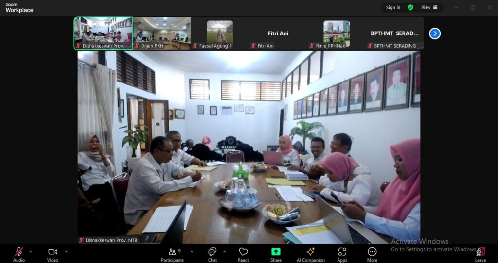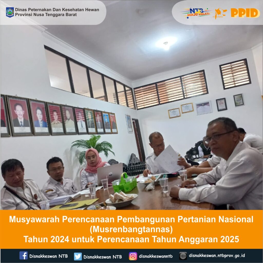 Kepala Dinas Peternakan dan Kesehatan Hewan (PKH) Provinsi Nusa Tenggara Barat (NTB), Muhamad Riadi, S.P., M.Ec.Dev., didampingi pejabat dan staf yang menangani fungsi perencanaan beserta bidang teknis terkait Peternakan dan Kesehatan Hewan (PKH) dan Prasarana dan Sarana Pertanian (PSP) mengikuti kegiatan desk pembahasan rancangan alokasi kegiatan dan anggaran tahun anggaran 2025 lingkup Ditjen PKH dan Ditjen PSP Kementerian Pertanian Republik Indonesia. Kegiatan ini merupakan rangkaian kegiatan Musyawarah Perencanaan Pembangunan Pertanian Nasional (Musrenbangtannas) Tahun 2024 untuk Perencanaan Tahun Anggaran 2025. Desk untuk wilayah Provinsi NTB ini dilaksanakan secara daring (online) melalui aplikasi Zoom Meeting pada Rabu, 26 Juni 2024, di ruang rapat Kepala Dinas PKH Provinsi NTB.