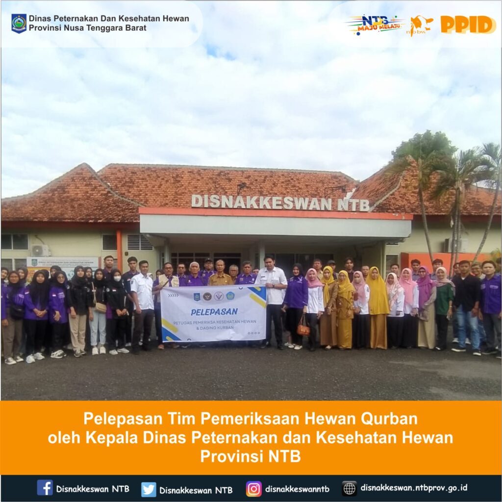 Kepala Dinas Peternakan dan Kesehatan Hewan Provinsi NTB, Muhamad Riadi, SP, M.Ec.Dev melepas Tim Pemeriksaan Hewan Qurban yang bertempat di Halaman Kantor Dinas Peternakan dan Kesehatan Hewan Provinsi NTB, Senin 10 Juni 2024 dimana Tim Pemeriksaan Hewan Qurban ini melibatkan seluruh Perhimpunan Dokter Hewan Indonesia NTB I, Balai Karantina Pertanian Kelas I Mataram serta Mahasiswa/Mahasiswi Kedokter Hewan Universitas Pendidikan Mandalika.