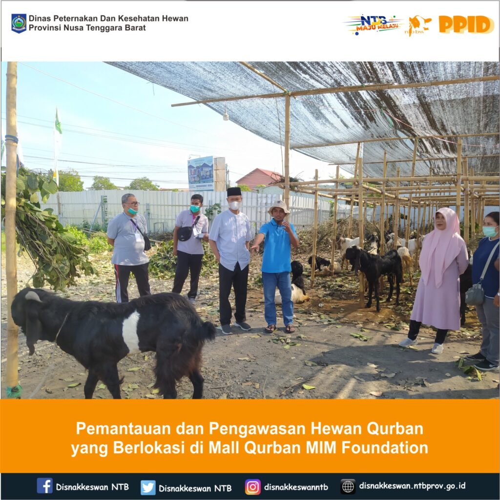 Kepala Dinas Peternakan dan Kesehatan Hewan Provinsi NTB, Muhamad Riadi, SP, M.Ec.Dev didampingi Kepala Bidang Kesehatan Masyarakat Veteriner dan Kepala Bidang Kesehatan Hewan melaksanakan pemantauan dan pengawasan hewan qurban yang berlokasi di Mall Qurban MIM Foundation yang berlokasi di Kecamatan Sekarbela Kota Mataram, Jumat 14 Juni 2024 dimana hewan qurban berupa lambung dan sapi sudah diperiksa semua oleh dokter hewan dan dinyatakan sehat.