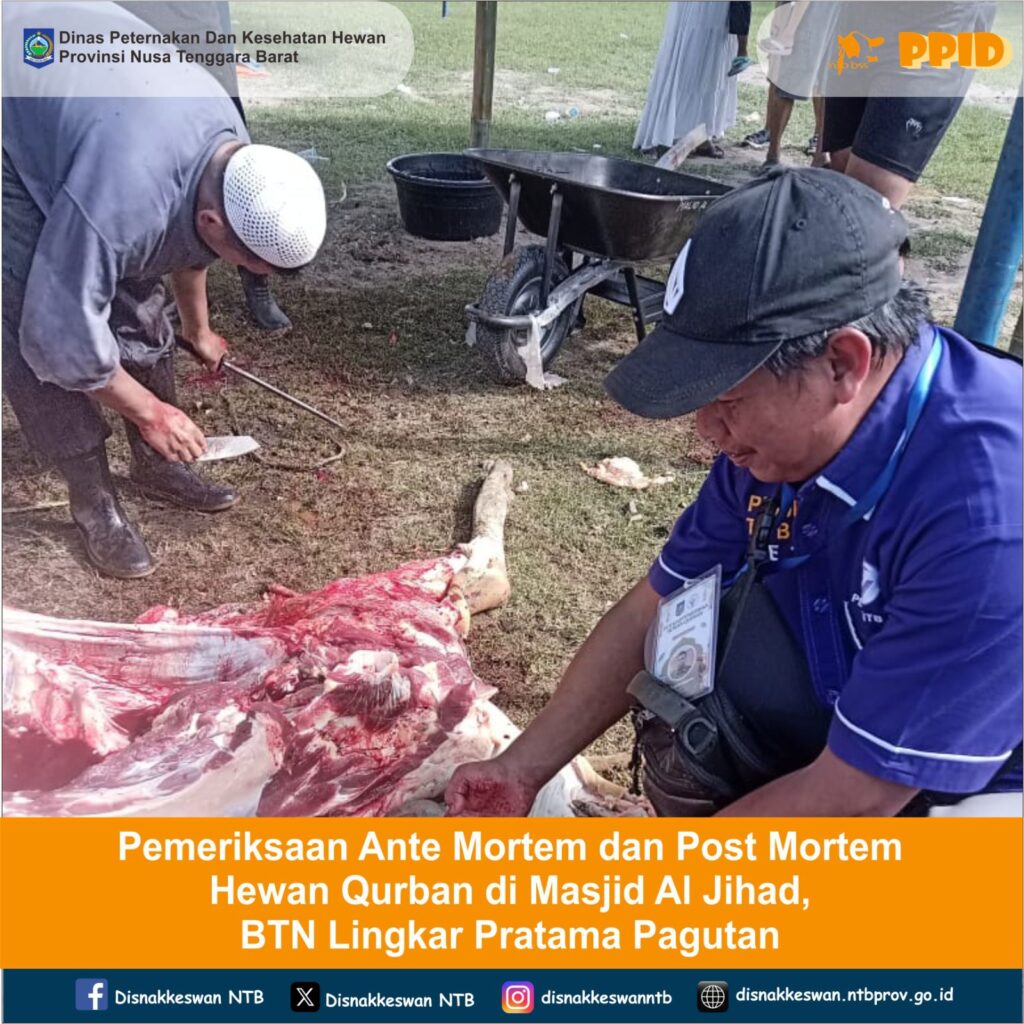 Jumat, 6 Juni 2025. Tim Pengawas Hewan Qurban Dinas Peternakan dan Kesehatan Hewan Provinsi NTB melaksanakan pemeriksaan ante mortem dan post mortem yang berlokasi di Masjid Al Jihad BTN Lingkar Pratama Pagutan dengan jumlah hewan qurban sapi 12 ekor, kambing 7 ekor.