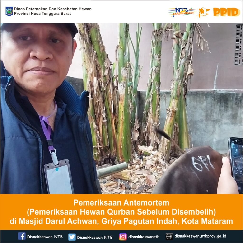 Tim Pengawas Kesehatan Hewan dan Daging Qurban Dinas Peternakan dan Kesehatan Hewan Provinsi NTB melaksanakan pemeriksaan antemortem yang berlokasi di Masjid Darul Achwan Griya Pagutan Indah Kota Mataram Minggu, 16 Juni 2024 dimana jumlah ternak yang diperiksa sebanyak 17 ekor sapi dan dinyatakan semua ternak sehat.