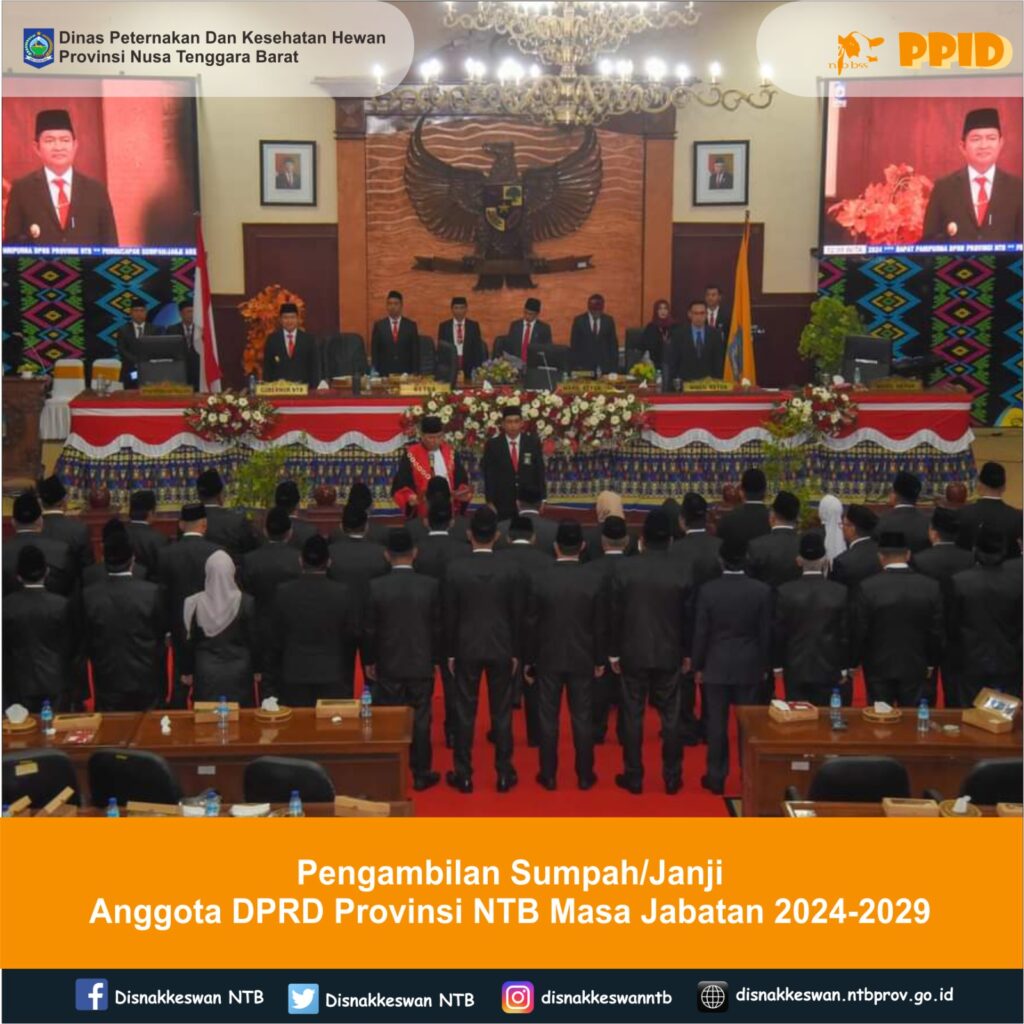 Kepala Dinas Peternakan dan Kesehatan Hewan Provinsi NTB, Muhamad Riadi, SP, M.Ec.Dev menghadiri Rapat Paripurna Dewan Perwakilan Rakyat Daerah Provinsi Nusa Tenggara Barat dalam rangka Pengambilan Sumpah/Janji Anggota DPRD Provinsi Nusa Tenggara Barat Masa Jabatan 2024-2029 yang dilaksanakan di Ruang Sidang Utama Gedung DPRD Provinsi NTB, Senin 2 September 2024.