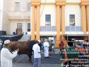 Jum’at 31 Juli 2020, Sekretaris Daerah Provinsi NTB Drs. H. Lalu Gita Ariadi, M.Si mewakili Bapak Gubernur NTB menyerahkan Sapi kurban Bapak Presiden RI ke pengurus Masjid Hubbul Wathan Islamic Center NTB. Penyerahan hewan kurban tersebut juga didampingi oleh tim medis dari UPTD Balai RSHLV lingkup Dinas Peternakan dan Kesehatan Hewan Provinsi NTB. Sapi jenis simental yang telah lolos pemeriksaan laboratorium UPTD Balai RSHLV banyumulek ini menjadi hewan kurban terberat se Indonesia dengan bobot mencapai 1,3 Ton.