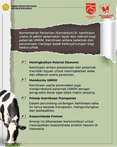 Untuk mewujudkan swasembada protein hewani, peternak dianjurkan untuk melakukan kemitraan dengan pengusaha peternakan. Hal ini dapat dilakukan demi meningkatkan skala dan potensi ekonomi yang berkeadilan bagi para peternak dan juga pengusaha
