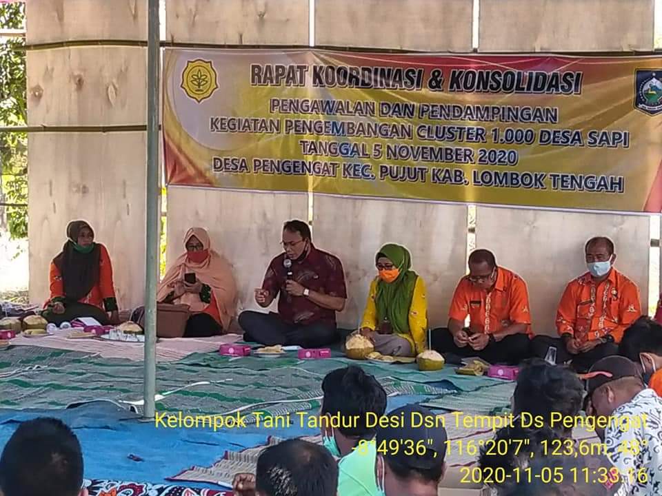Kepala Dinas Peternakan dan Kesehatan Hewan Provinsi Nusa Tenggara Barat menghadiri Rapat Koordinasi dan Konsolidasi Pengawalan dan Pendampingan Kegiatan Pengembangan Cluster 1000 Desa Sapi dimana kegiatan ini dilaksanakan oleh Bidang Perbibitan dan Produksi Pakan Dinas Peternakan dan Kesehatan Hewan Provinsi NTB pada tanggal 5 November 2020 yang berlokasi di Desa Pengengat Kecamatan Pujut Kabupaten Lombok Tengah.