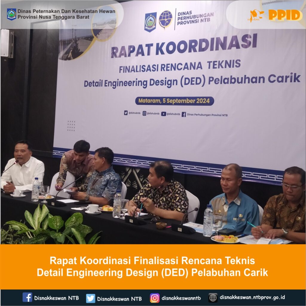 Kepala Dinas Peternakan dan Kesehatan Hewan Provinsi NTB, Muhamad Riadi, SP, M.Ec.Dev menghadiri sekaligus menjadi narasumber pada Rapat Koordinasi Finalisasi Rencana Teknis Detail Engineering Design (DED) Pelabuhan Carik yang diselenggarakan oleh Dinas Perhubungan Provinsi NTB di Hotel Lombok Astoria, Kamis 5 September 2024.