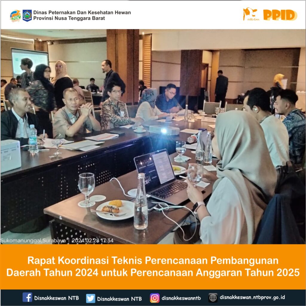 Surabaya, 28-29 Februari 2024 bertempat di Hotel Vasa Surabaya Provinsi Jawa Timur Kepala Dinas Peternakan dan Kesehatan Hewan, Muhamad Riadi, SP, M.Ec.Dev menghadiri Rapat Koordinasi Teknis Perencanaan Pembangunan Daerah Tahun 2024 untuk Perencanaan Anggaran Tahun 2025, untuk membahas indikor utama daerah yang diselaraskan dengan indikator pusat untuk urusan pertanian.