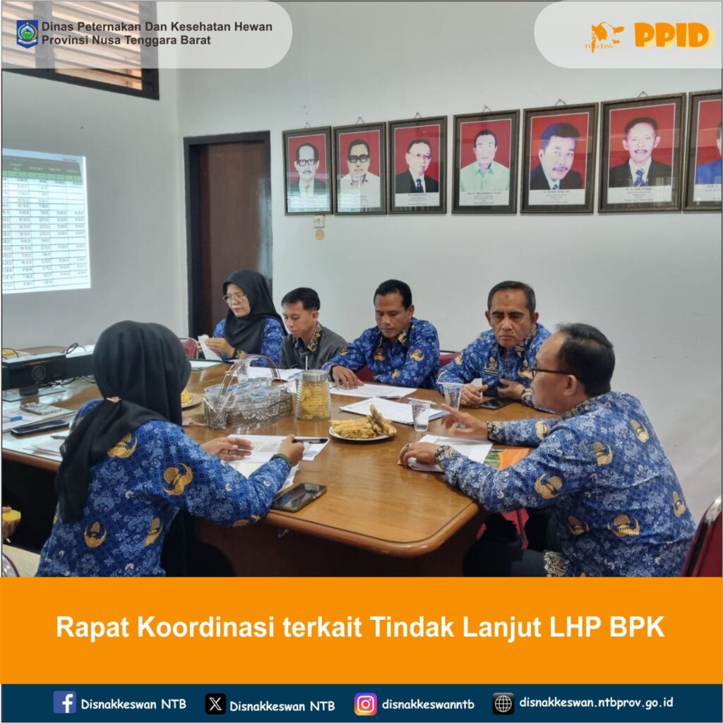 Plt. Kepala Dinas Peternakan dan Kesehatan Hewan Provinsi NTB, Ahmad Masyhuri, S.H didampingi oleh Sekretaris Dinas memimpin Rapat Koordinasi terkait tindak lanjut LHP BPK yang dilaksanakan di Ruang Rapat Kepala Dinas, Kamis 17 Juli 2025.