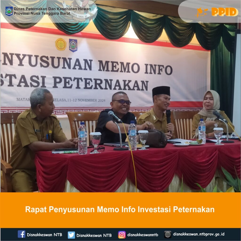 Kepala Dinas Peternakan dan Kesehatan Hewan Provinsi NTB, Muhamad Riadi, SP, M.Ec.Dev menghadiri sekaligus memberikan arahan pada kegiatan Rapat Penyusunan Memo Info Investasi Peternakan yang diselenggarakan oleh Bidang Penyuluhan Pengolahan dan Pemasaran Hasil Peternakan (P3HP) yang bertempat di Hotel Lombok Garden, Selasa 12 November 2024.