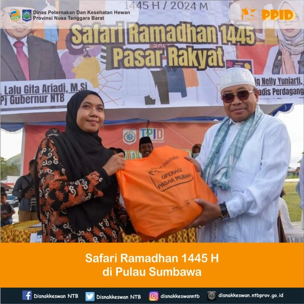 Kepala Dinas Peternakan dan Kesehatan Hewan Provinsi NTB, Muhamad Riadi, SP, M.Ec.Dev mengikuti rangkaian kegiatan Safari Ramadhan Penjabat Gubernur NTB, Drs. H. Lalu Gita Ariadi, M.Si di Pulau Sumbawa yang diawali dengan meninjau gerakan pangan murah yang dilaksanakan di Pendopo Bupati Sumbawa Barat.
