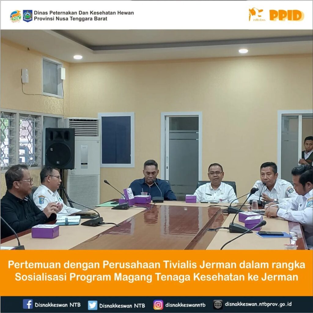 Kepala Dinas Peternakan dan Kesehatan Hewan Provinsi NTB, Muhamad Riadi, SP, M.Ec.Dev mengikuti pertemuan dengan perusahaan Tivialis Jerman dalam rangka Sosialisasi Program Magang Tenaga Kesehatan ke Jerman yang bertempat di Ruang Rapat Melati Kantor Gubernur NTB, Rabu 24 Januari 2024.